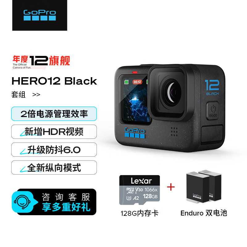 GoProHERO12 Black防抖运动相机 户外出行潜水防水相机 128G内存卡+Enduro增强电池 双电池版价格:2970.00元!