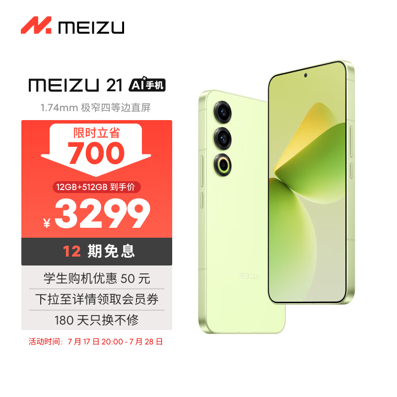 魅族(MEIZU)21 12GB+512GB 锐意青 1.74mm极窄四等边直屏 骁龙8Gen3 2亿像素 80W超充 5G游戏学生拍照手机价格:3299.00元!