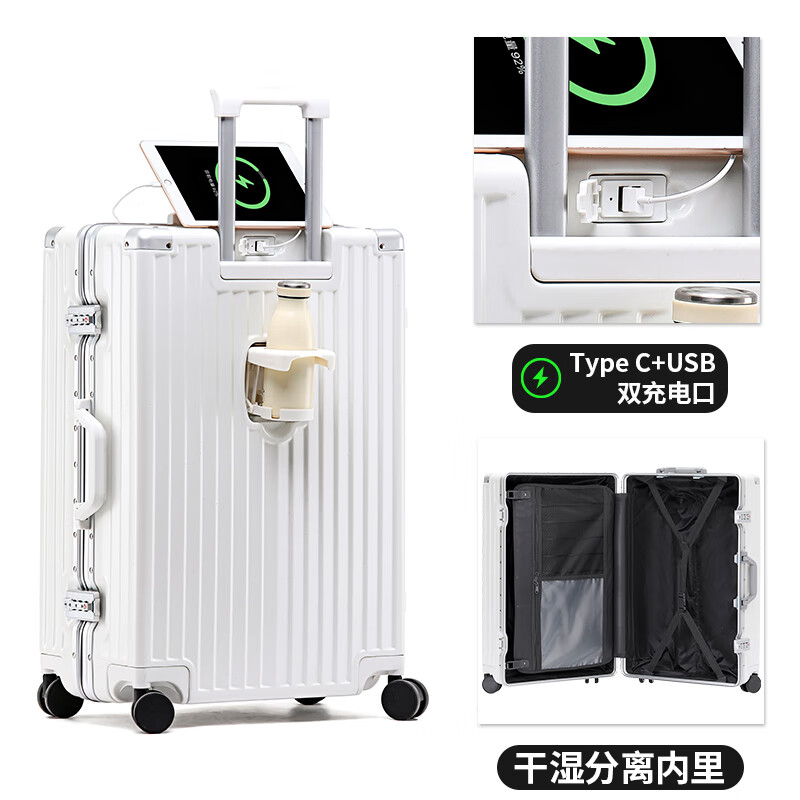 DULA铝框行李箱高颜拉杆箱杯架USB充电旅行密码箱皮箱子皓月白26英寸价格:439.00元!