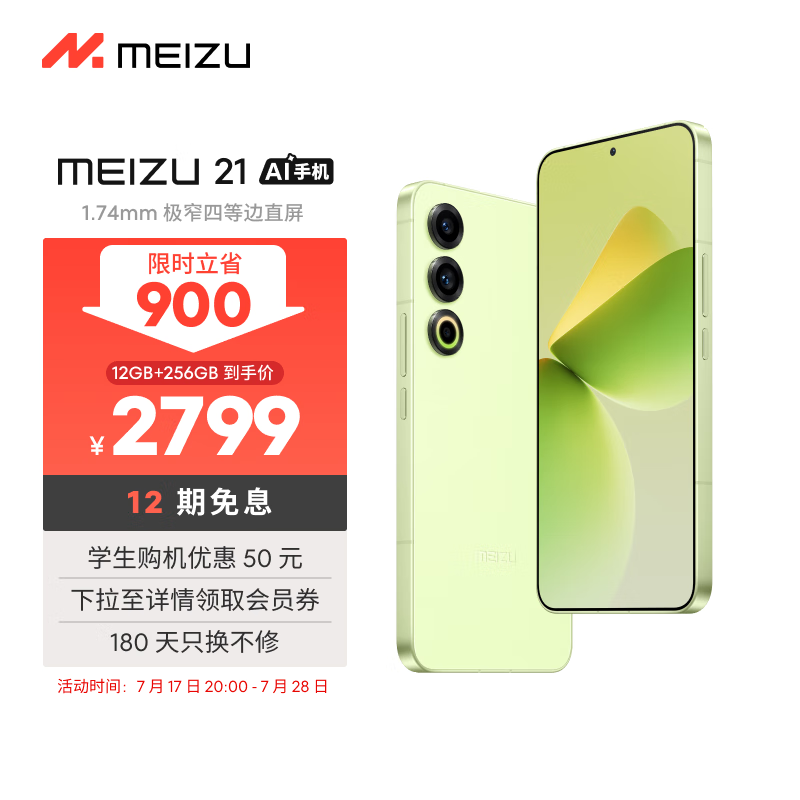 魅族(MEIZU)21 12GB+256GB 锐意青 1.74mm极窄四等边直屏 骁龙8Gen3 2亿像素 80W超充 5G游戏学生拍照手机价格:2899.00元!
