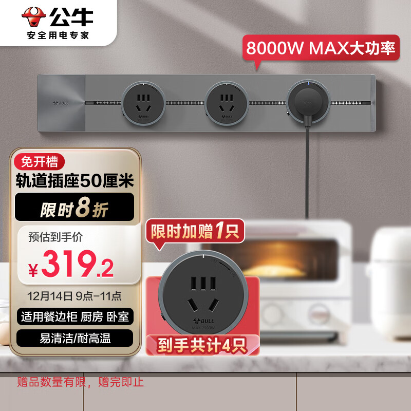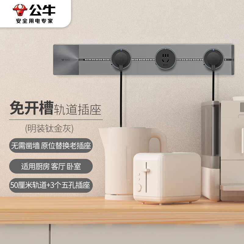 公牛(BULL)明装 轨道插座 可移动墙壁插座壁挂式/插线板/接线板 多功能免打孔 50厘米轨道+3个五孔插座灰色价格:399.00元!