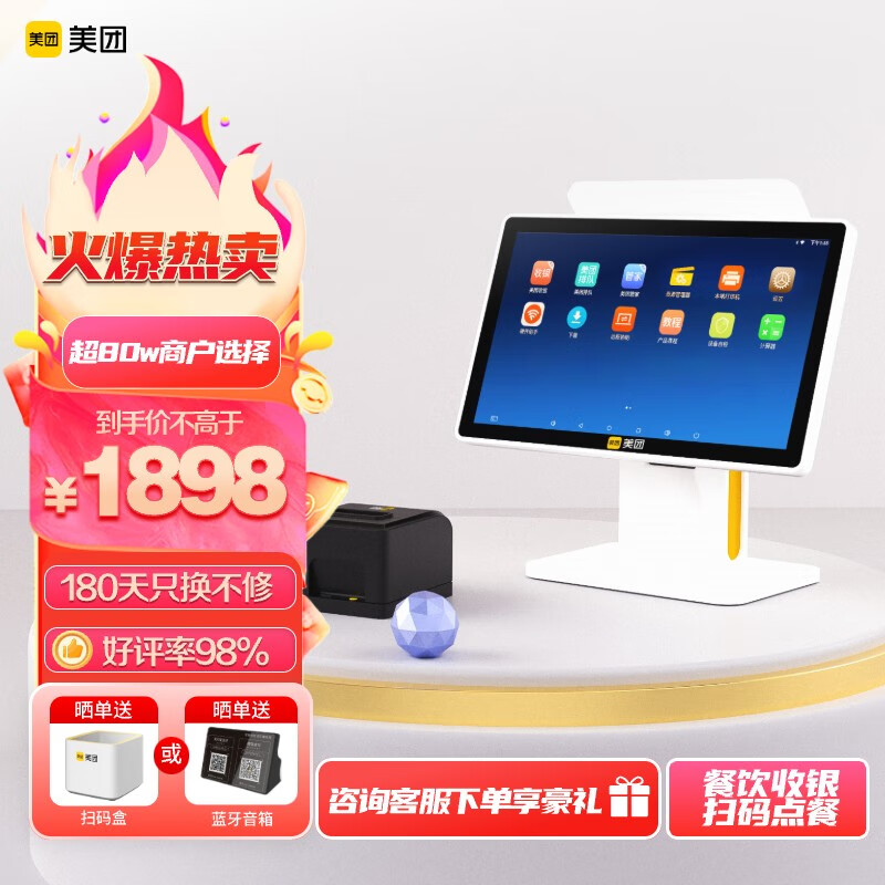 美团(Meituan )双屏收银机餐饮火锅小吃店 扫码支付收银系统(收银机+58打印机)双屏套餐一价格:1898.00元!