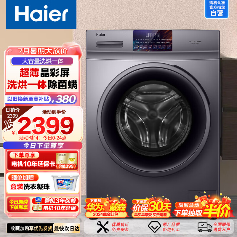 海尔(Haier)10KG全自动变频滚筒超薄洗衣机 洗烘一体洗衣机带烘干 晶彩触控显示 蒸汽除菌微蒸汽空气洗价格:2399.00元!