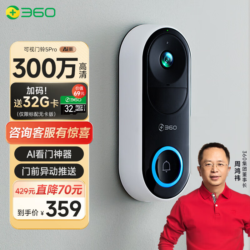 360 可视门铃5Pro摄像头家用监控摄像头智能摄像机2K智能门铃电子猫眼无线wifi 300W超清夜视AR1C价格:359.00元!