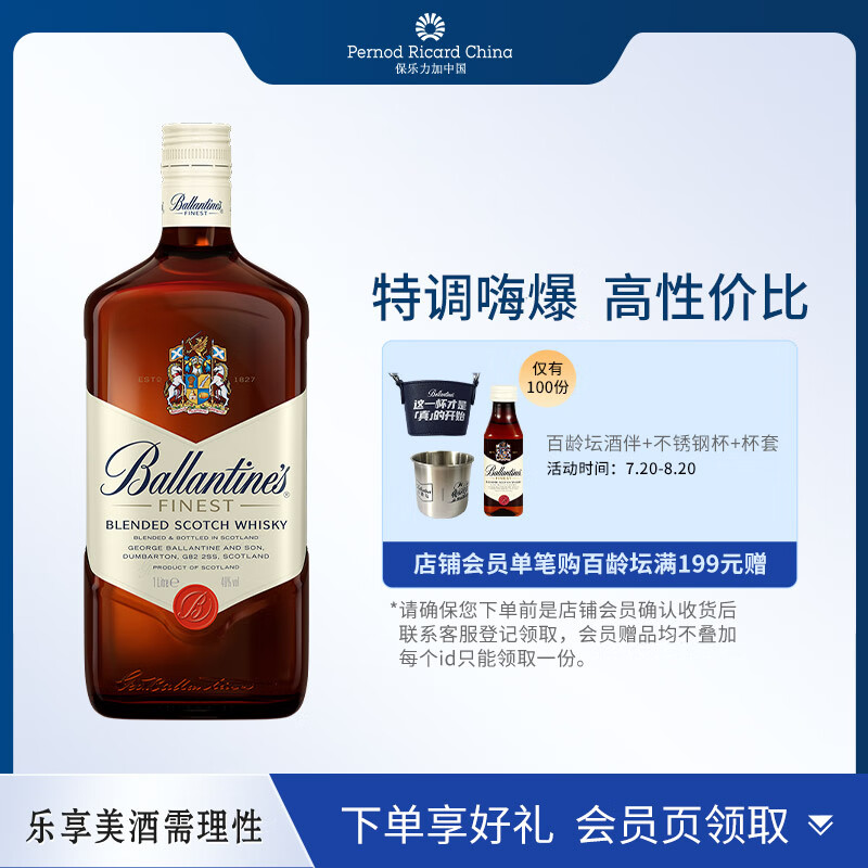 百龄坛(Ballantine`s) 特醇 苏格兰 调和型 威士忌 洋酒 1000ml(1L)价格:109.00元!