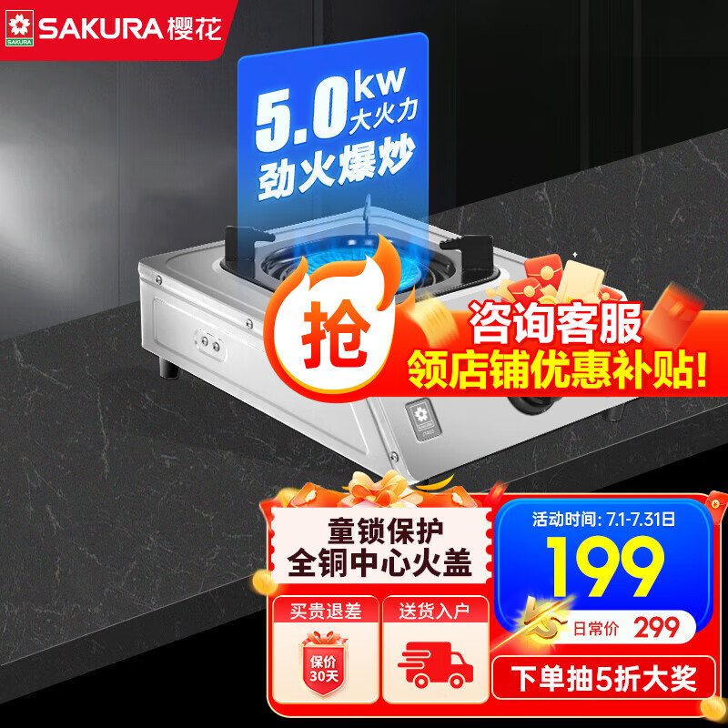 樱花(SAKURA)燃气灶不锈钢材质台上灶二级能效节能家用大火力灶具5.0KW猛火台式单眼灶液化气灶煤气灶 JTA03【液化气】5.0kw价格:199.00元!