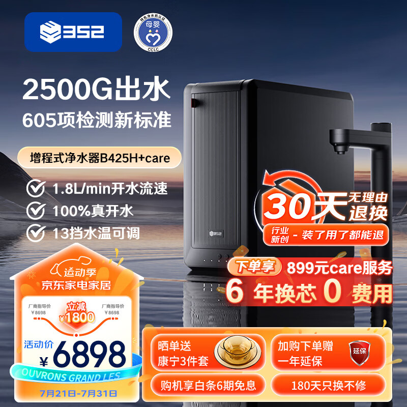 352净水器家用直饮加热一体机 2500G常温出水 400G通量6.5L/min 厨下即热饮水机B425H+care服务价格:7098.00元!