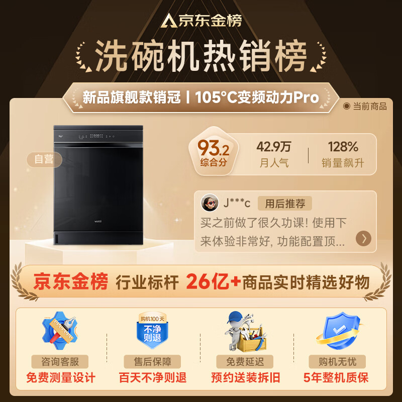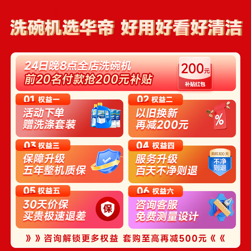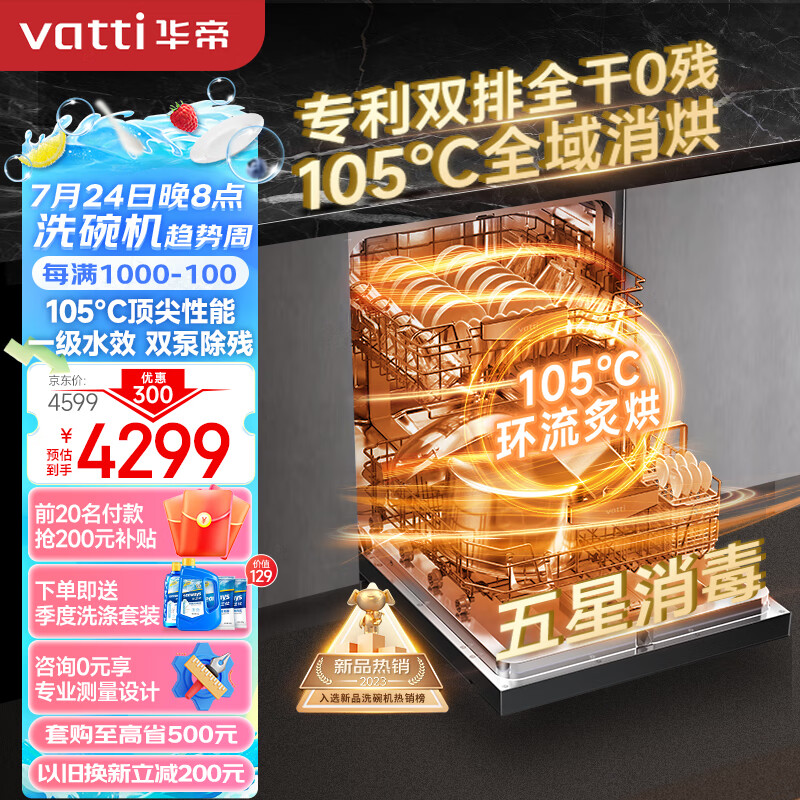 华帝(VATTI)变频洗碗机15套嵌入式洗消一体 105℃热风烘干+5万帕高水压全域洗 家用杀菌一级水效独立式D1000价格:4699.00元!