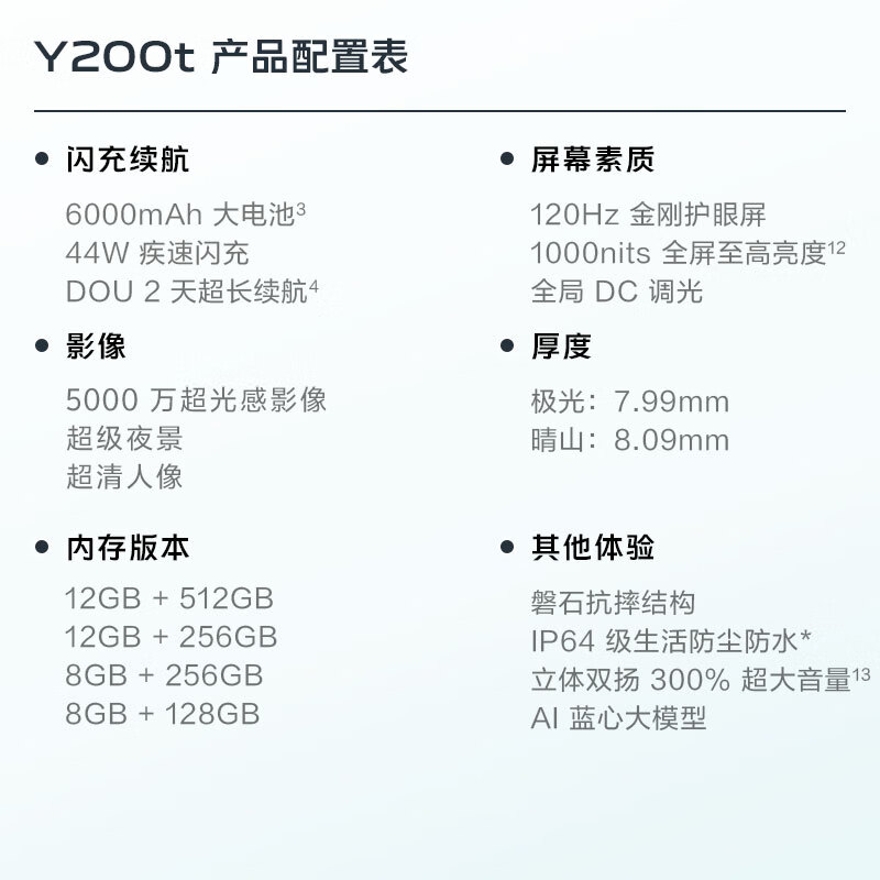 vivo Y200t 8GB+256GB 晴山 44W 6000mAh 120Hz金刚护眼屏 双扬300%大音量 5G 拍照 手机价格:1299.00元!