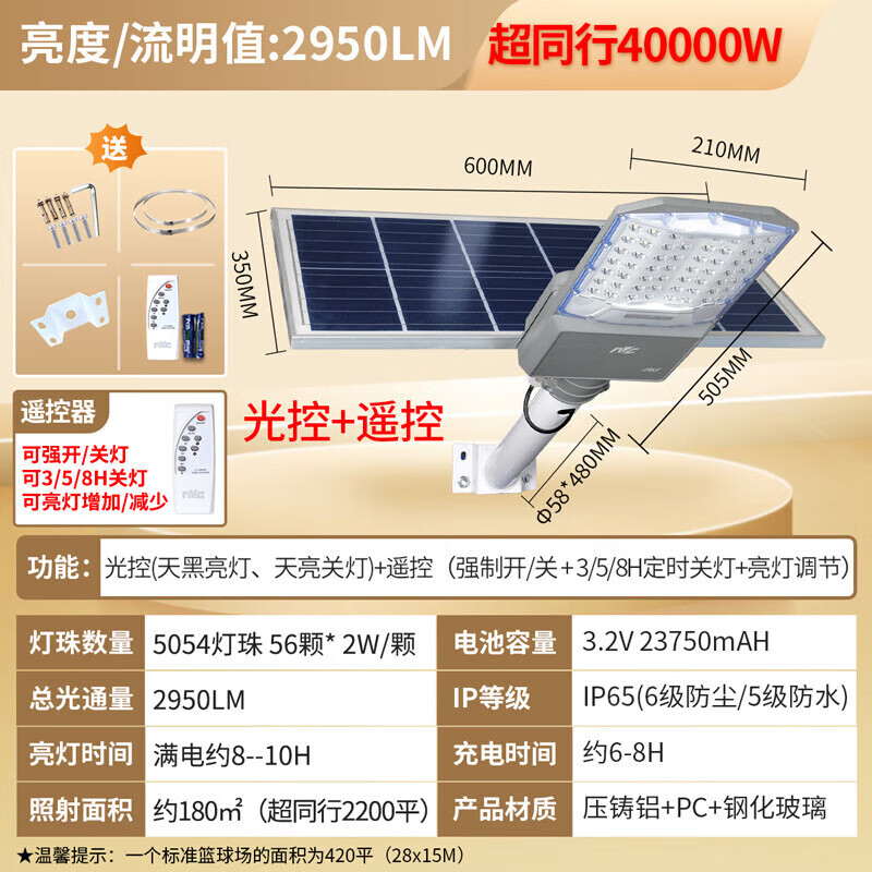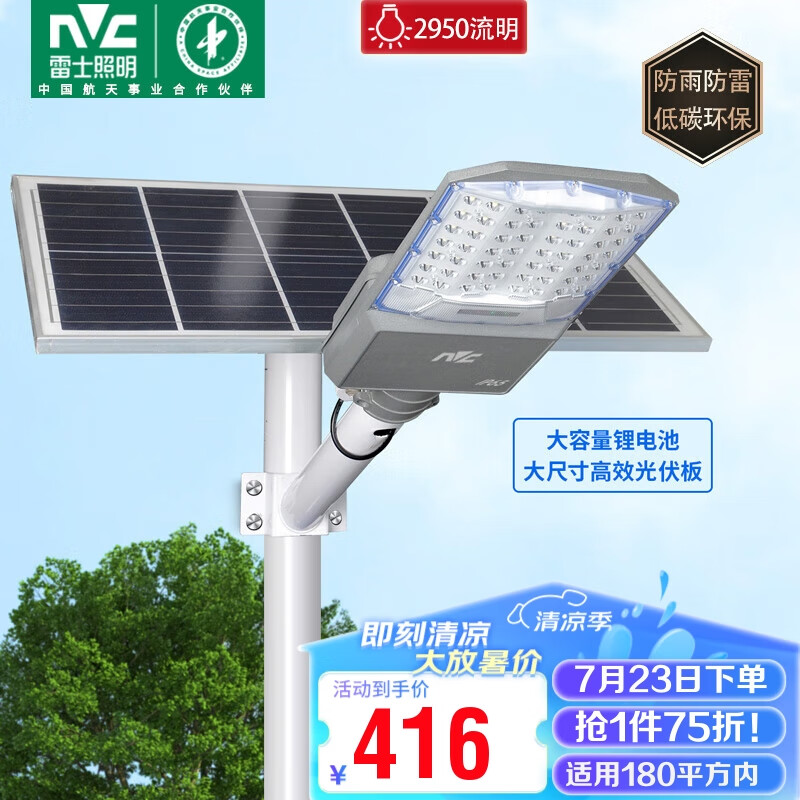雷士(NVC)太阳能灯户外照明庭院灯路灯农村室外防水灯高亮2950lm+照约180㎡价格:555.00元!