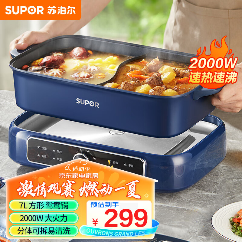 苏泊尔(SUPOR)电火锅 多功能电煮锅 火锅专用锅 分体式家用涮肉鸳鸯电热锅 7L多用途锅H3925FK872Y价格:299.00元!