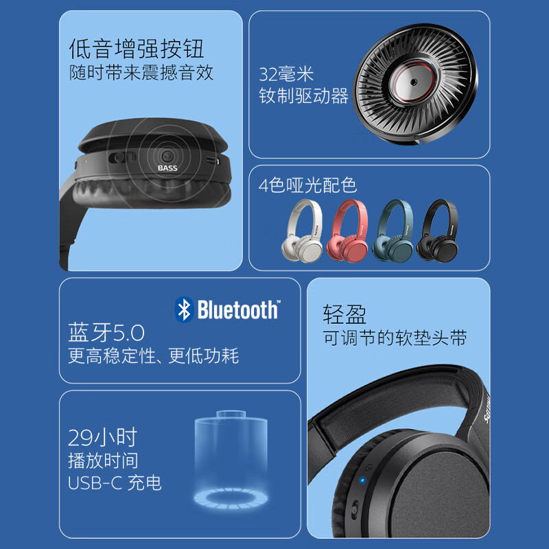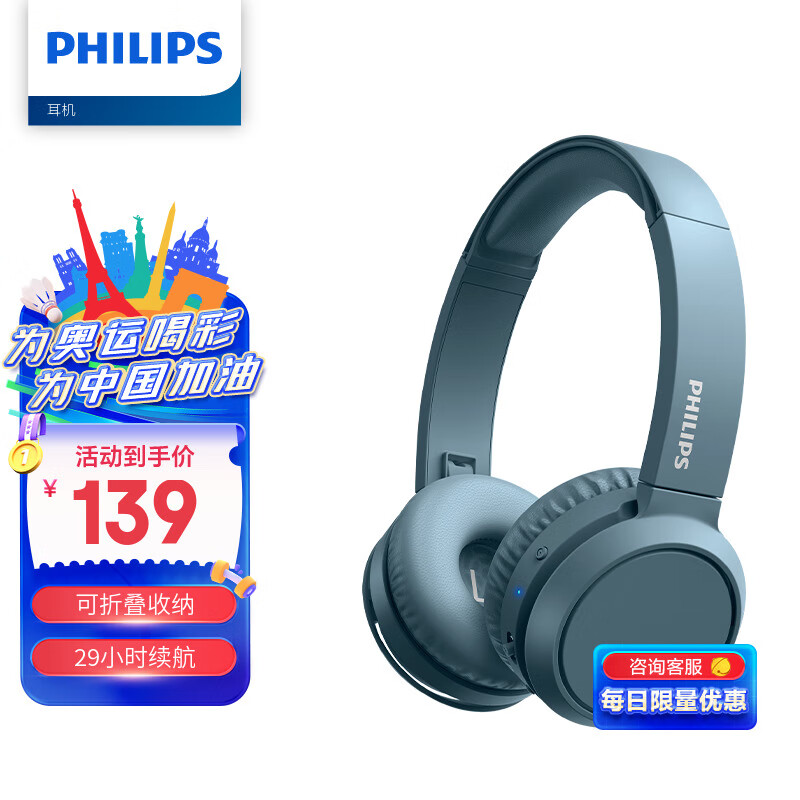 飞利浦(PHILIPS)头戴式蓝牙耳机无线运动耳机网课电脑耳麦 苹果华为小米安卓手机通用TAH4205青瓷蓝价格:139.00元!