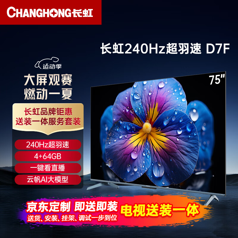 长虹电视75D7F 【包安装】75英寸4K超高清游戏电视 240Hz超羽速 4+64GB 一键看电视 智能平板液晶电视价格:4398.00元!