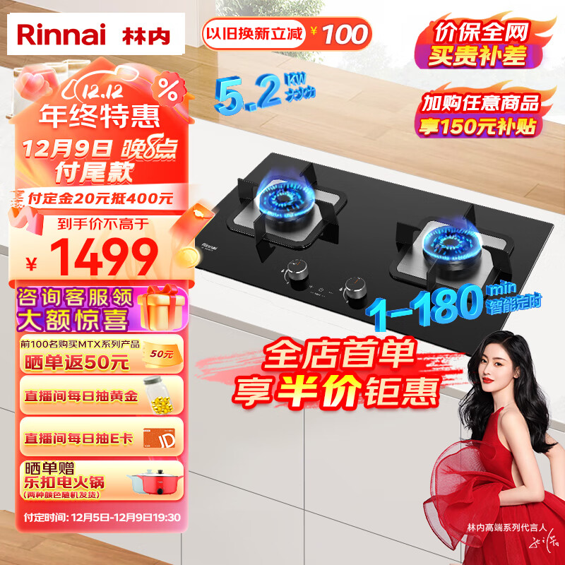 林内(Rinnai)[哪吒系列]家用嵌入式天燃气灶 台嵌两用可调节底盘 5.2kW双眼猛火定时灶 钢化玻璃 JZT-2E07MTX价格:1499.00元!