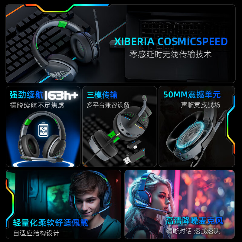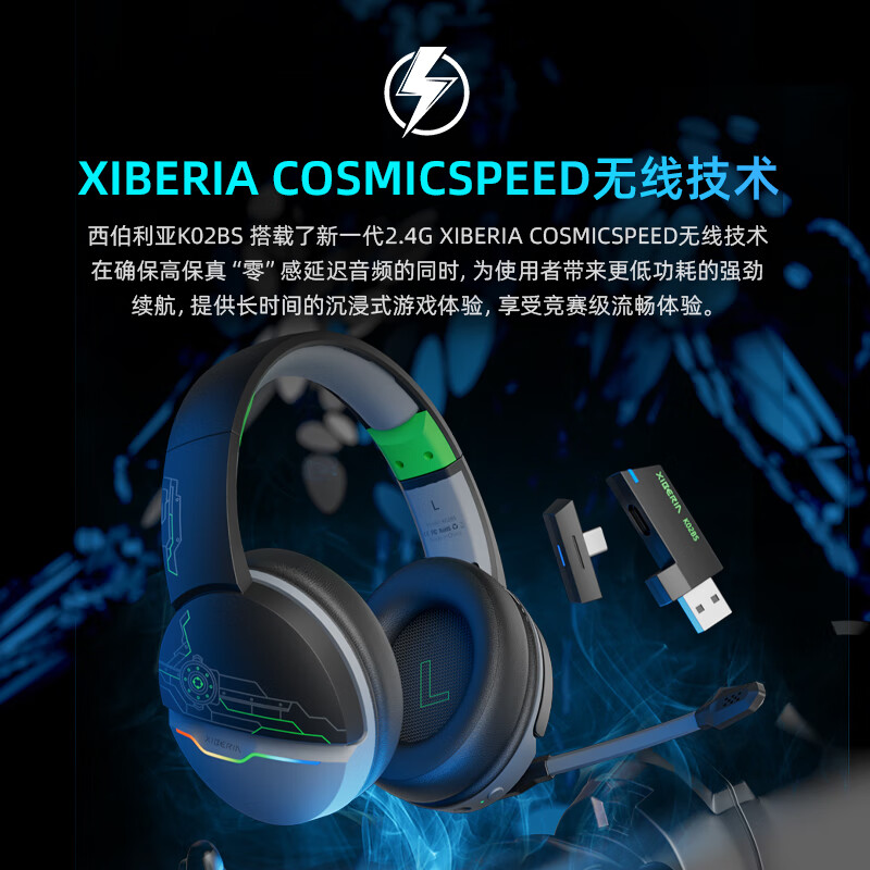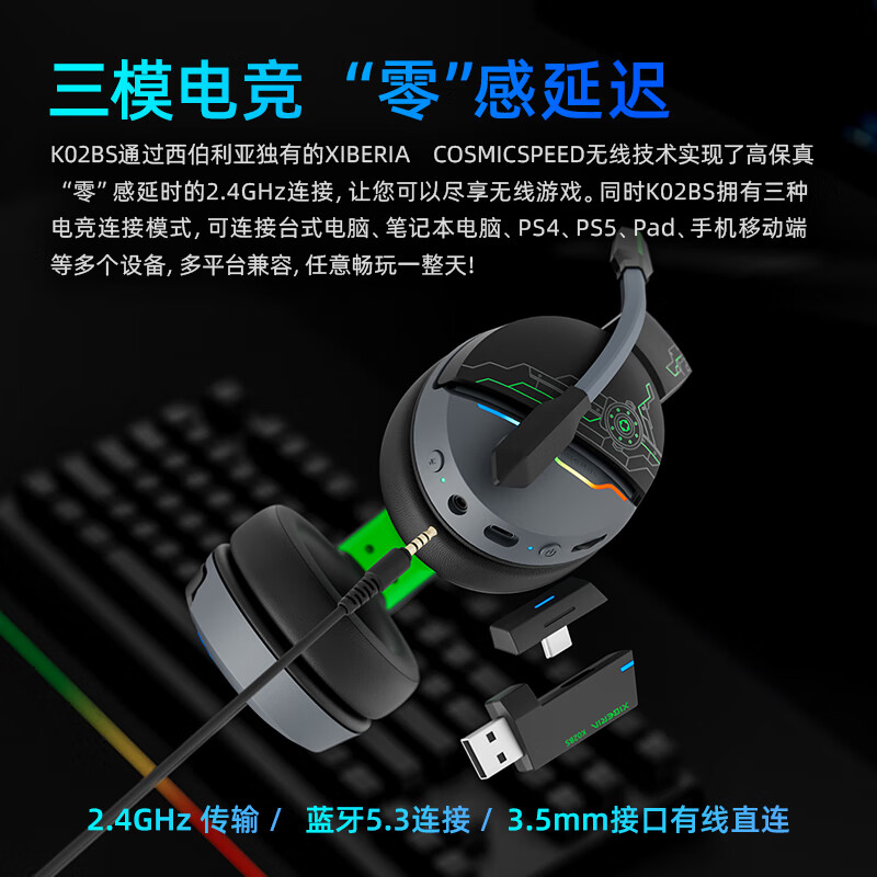 西伯利亚 K02BS2.4G真无线蓝牙游戏耳机头戴式手机低延迟电竞专用三模耳机台式电脑耳机麦克风二合一黑绿色价格:199.00元!