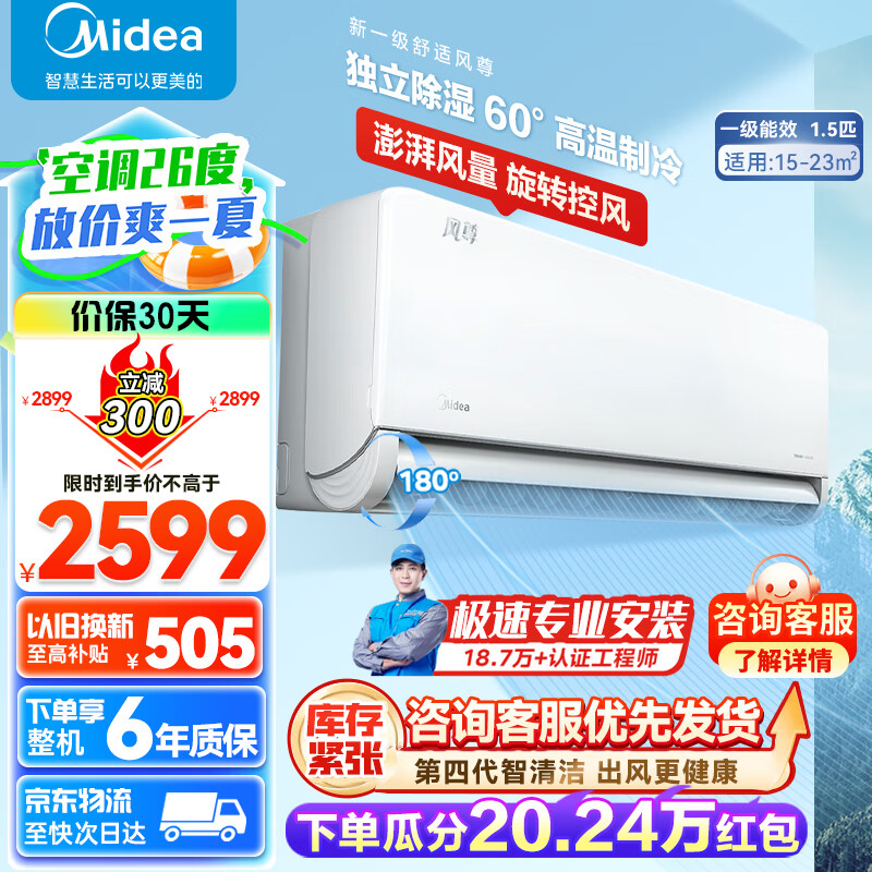 美的(Midea)空调挂机 1.5匹风尊时尚版 新一级变频冷暖 壁挂式卧室空调挂机大风口 3D环游风 KFR-35GW/N8MXC1价格:2599.00元!