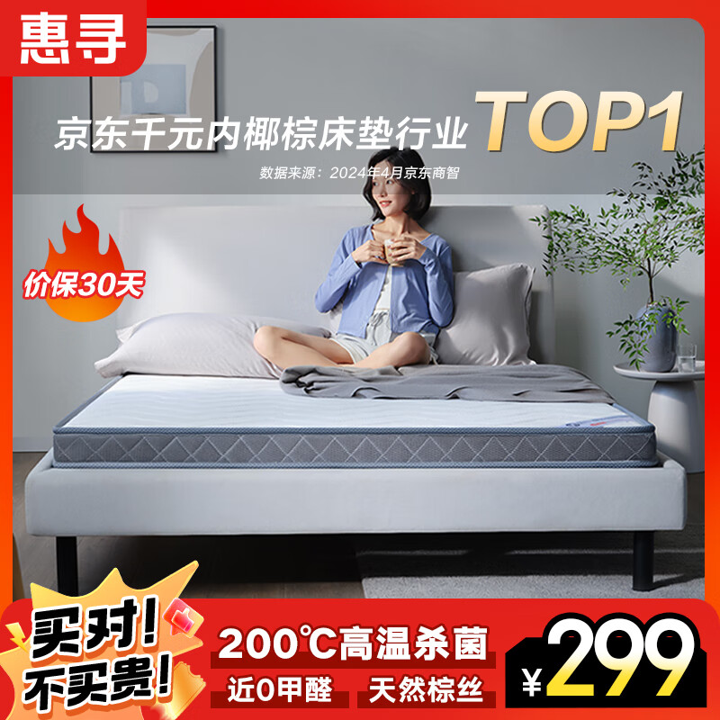 惠寻 京东自有品牌椰棕床垫硬棕垫薄床垫偏硬无胶水1*1.9米10cm厚价格:329.00元!