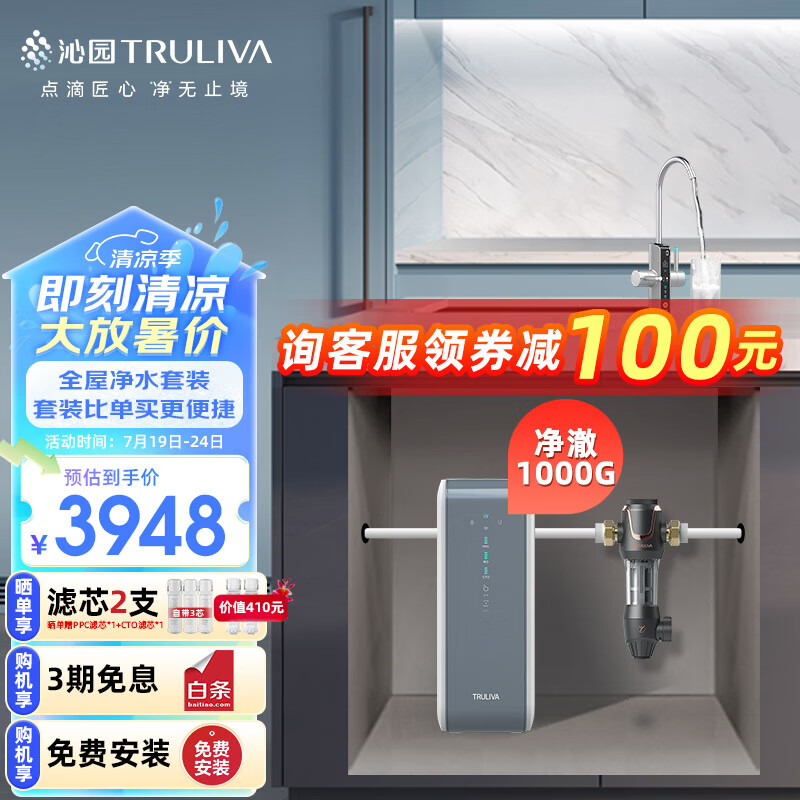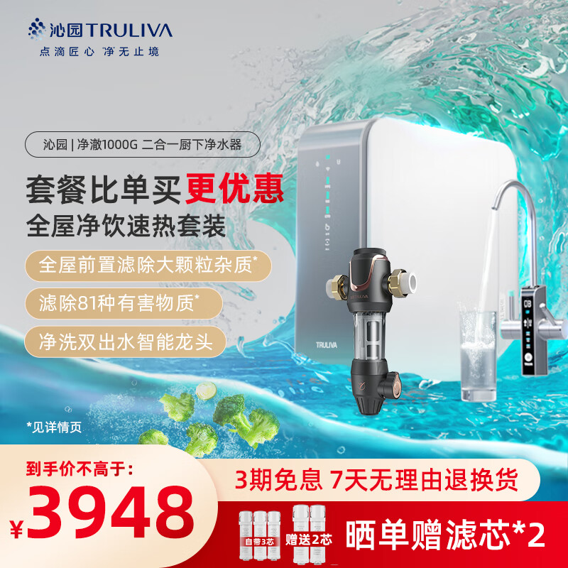 沁园(TRULIVA)净澈双出水1000G二件套装 净水器UR-SX51070+前置过滤器P-A5510(黑)价格:3948.00元!