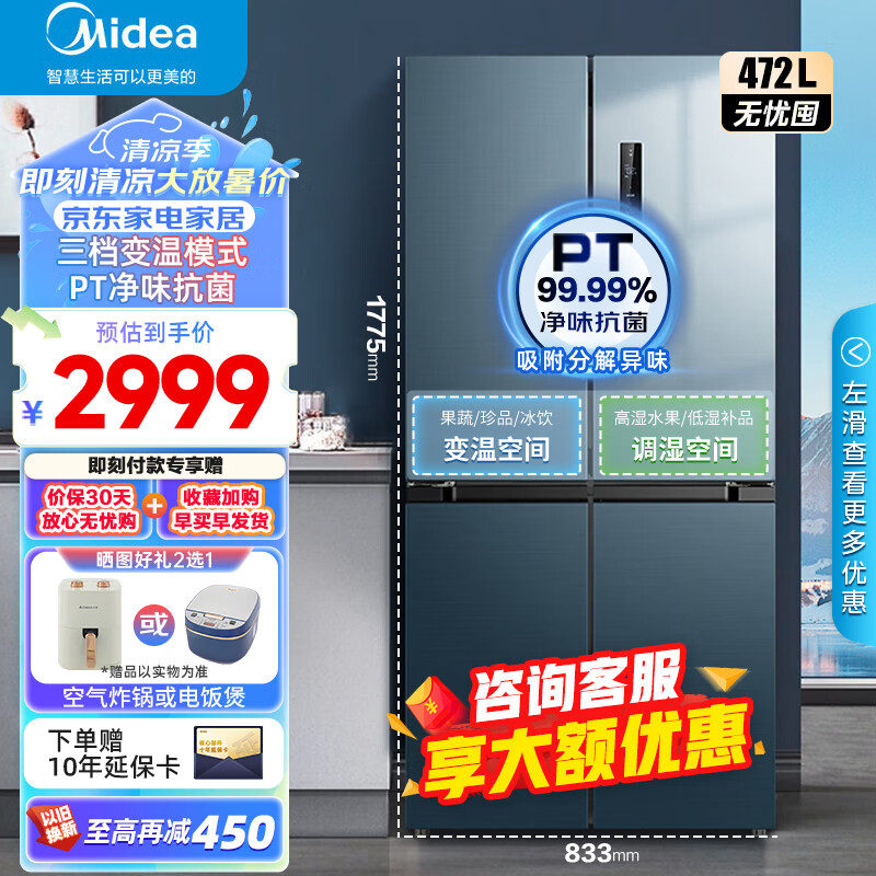 美的(Midea)果润精储472升一级双变频十字双开四开门家用电冰箱京东小家智能家电BCD-472WSPZM(E)超薄大容量价格:2999.00元!