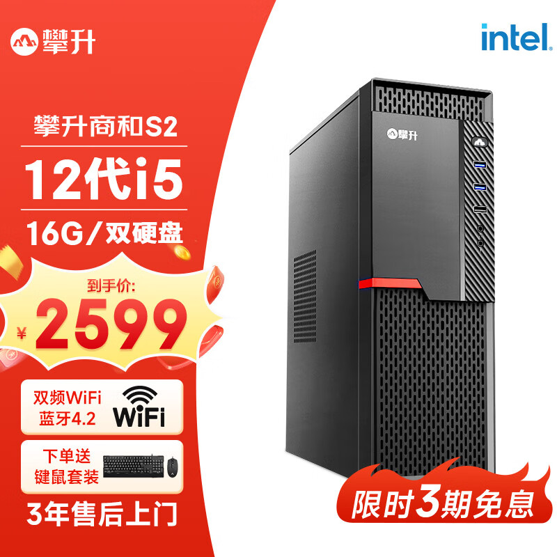 攀升商和S2 办公商用台式电脑全套整机(12代i5-12400 16G 256G+1T WiFi 键鼠 3年上门)单主机diy组装机价格:2799.00元!