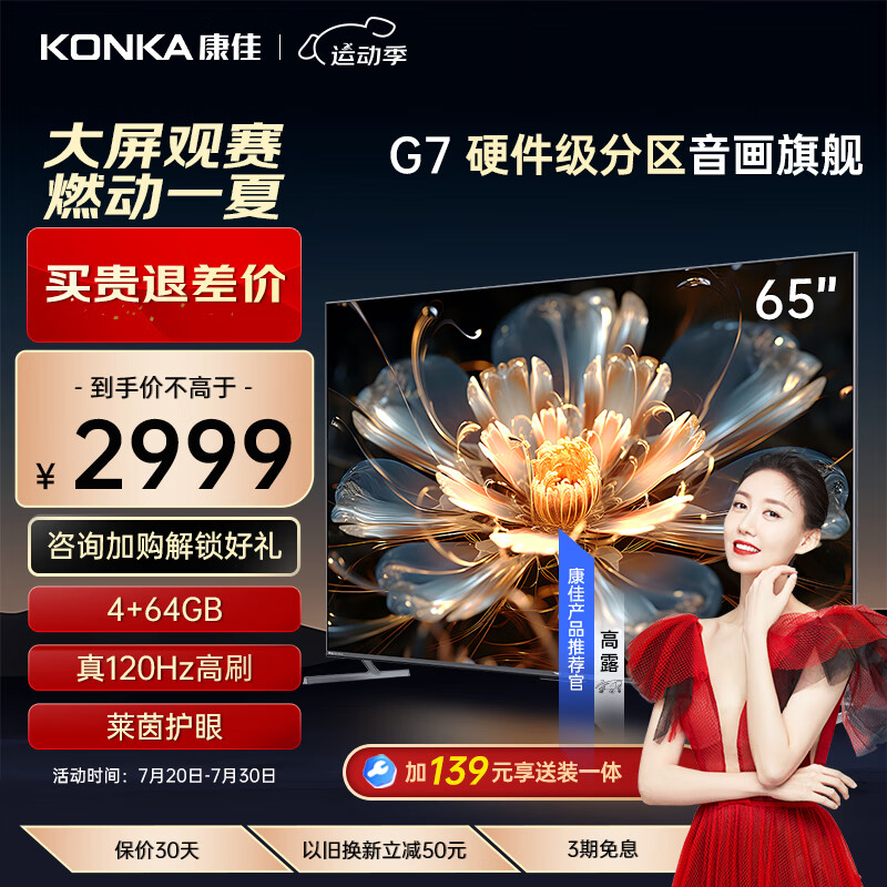 康佳电视 65G7 65英寸 百级分区背光 120Hz MEMC 4+64GB 4K超清屏智能液晶平板游戏电视机以旧换新价格:2699.00元!