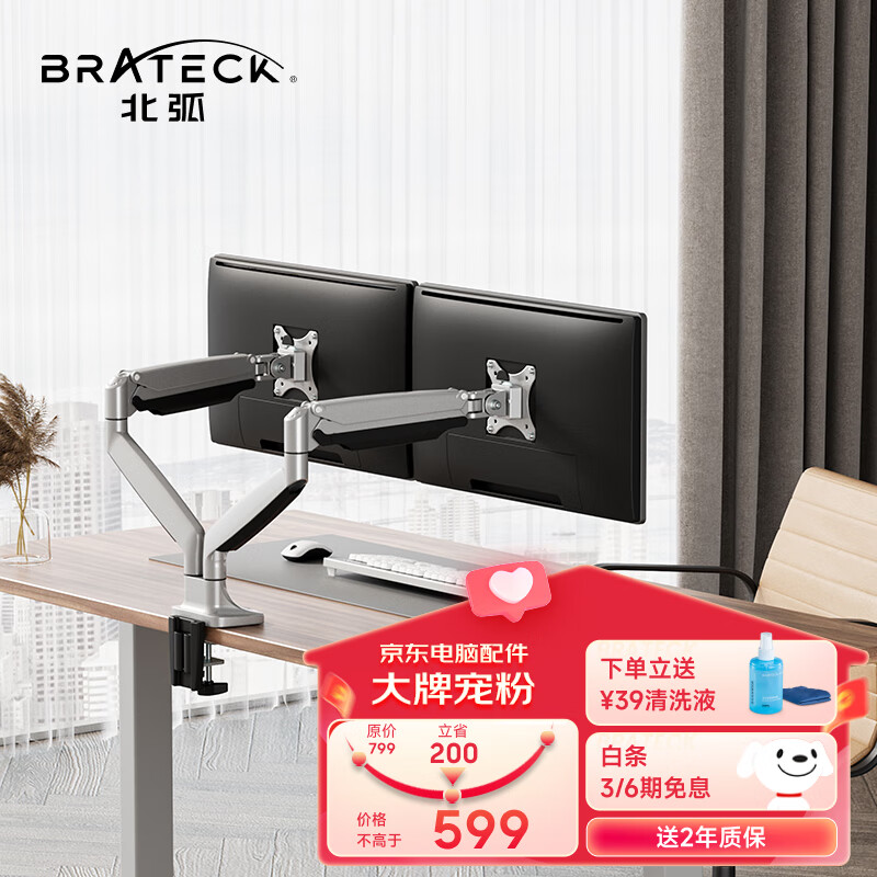 Brateck北弧 显示器支架双屏 电脑显示器支架 双屏支架臂 台式电脑支架升降 显示器增高架 桌面旋转底座LDT10价格:599.00元!