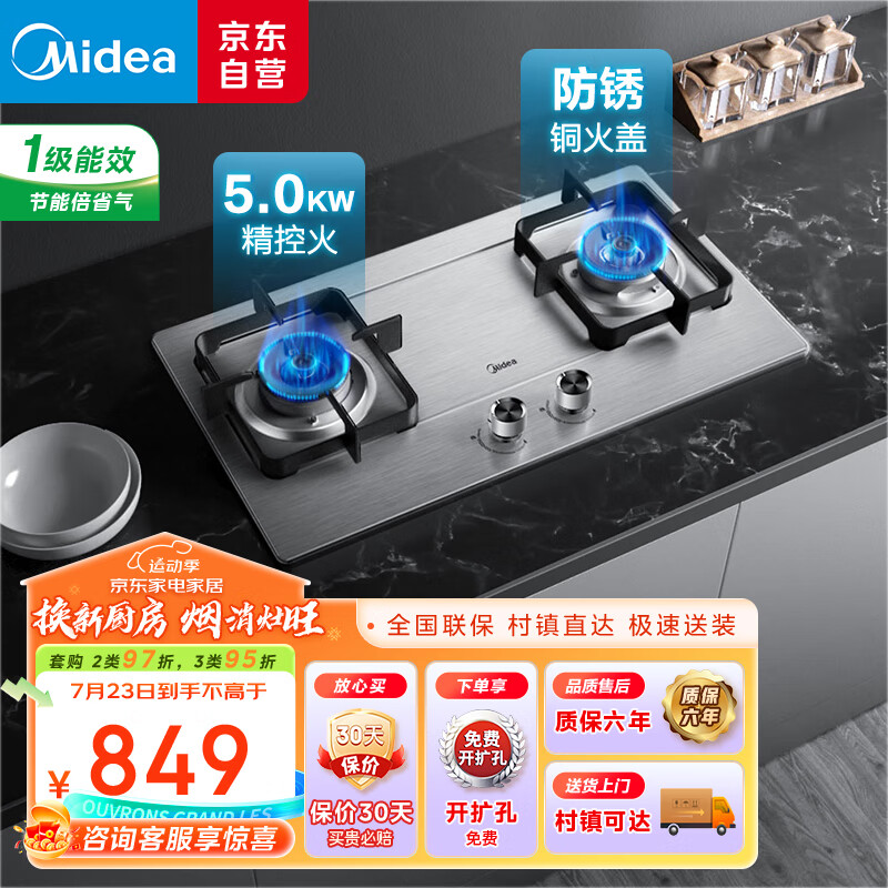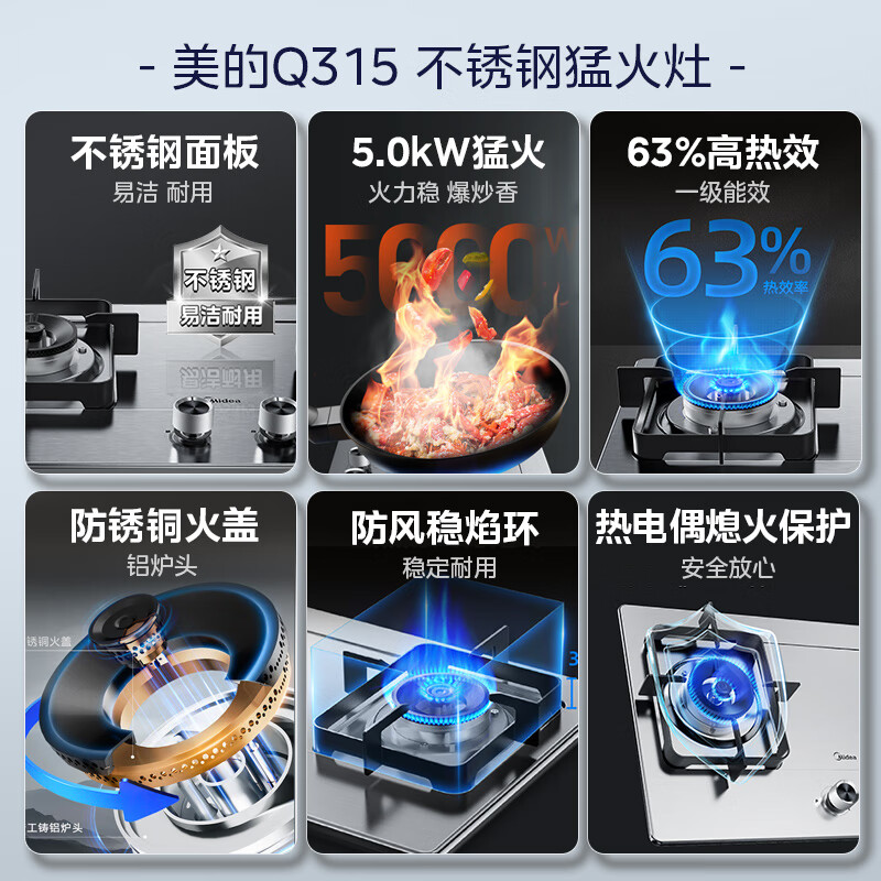 美的(Midea)燃气灶液化气 双灶具 家用5.0kW猛火灶台嵌两用 不锈钢面板 线性精控 一级能效 Q315-M价格:849.00元!