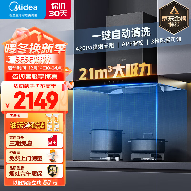 美的(Midea)抽油烟机灶具套装 家用欧式21大风量自动清洗吸烟机 5kW铜火盖燃气灶T201+Q230A液化气价格:2149.00元!