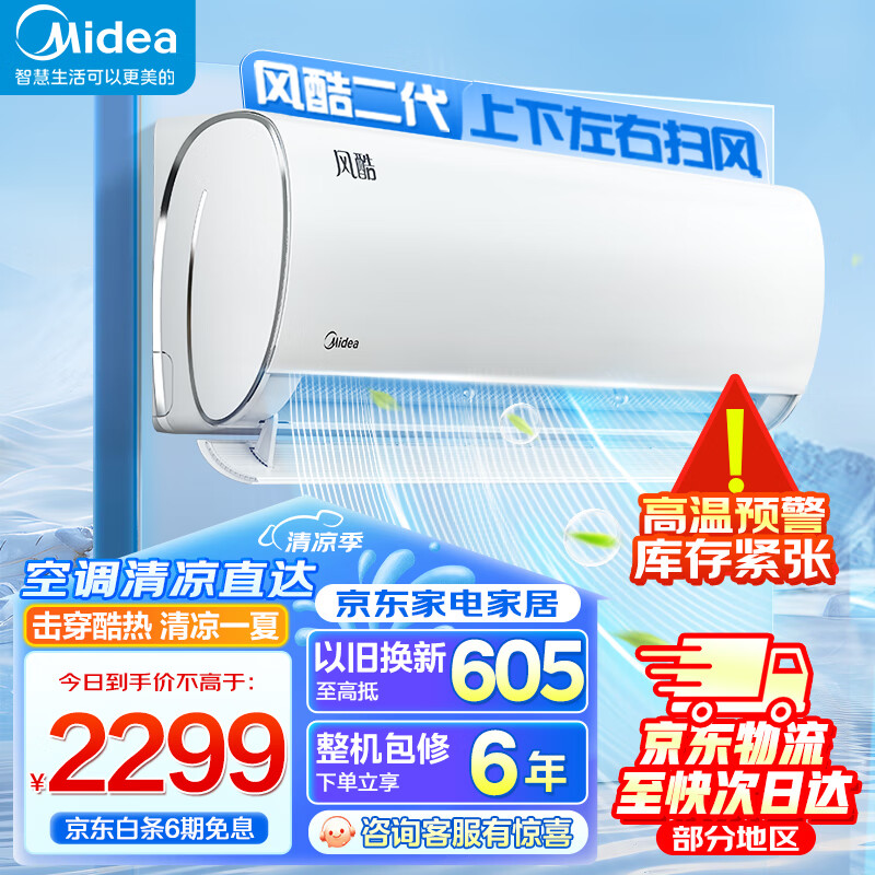 美的(Midea)空调 风酷 升级省电冷暖 高温自清洁 智能除湿 壁挂式卧室挂机 大1.5匹 [新一级能效]价格:2299.00元!