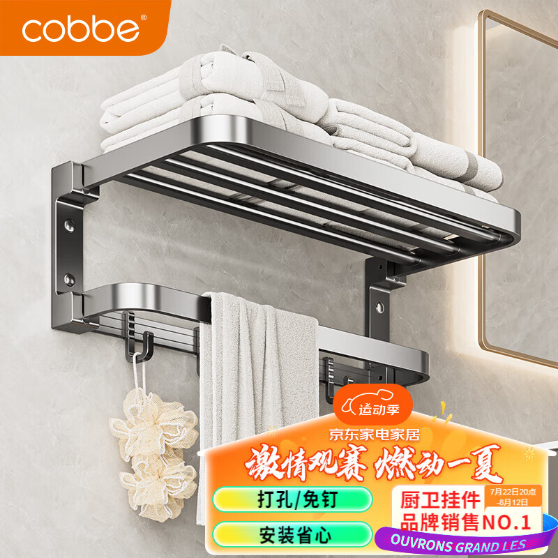 卡贝(cobbe)太空铝毛巾架浴室壁挂式免打孔卫生间置物架厕所洗手间浴巾架挂件价格:158.00元!