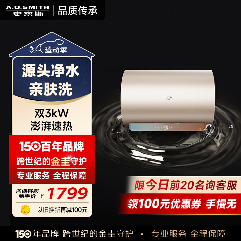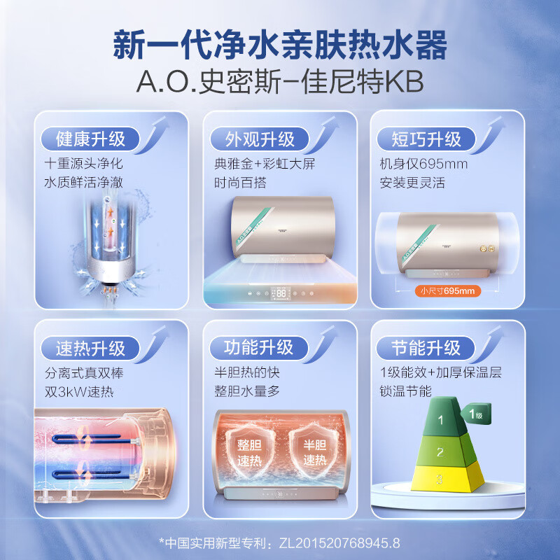 史密斯(A.O.SMITH)佳尼特60升电热水器 专利免清洗 金圭内胆更耐用 短款易安装 双棒速热CTE-60KB以旧换新价格:1899.00元!
