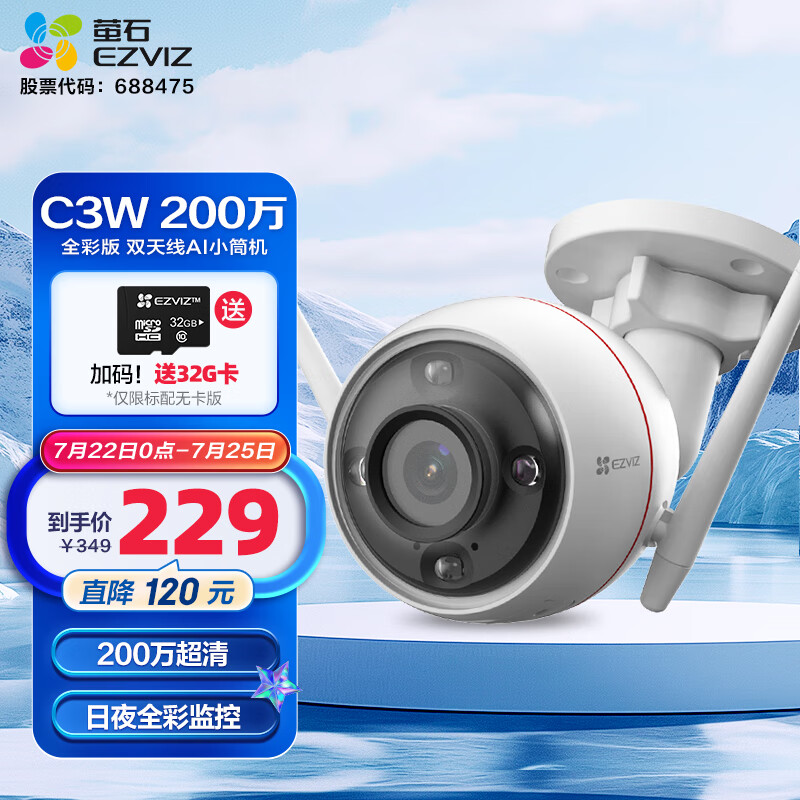 萤石(EZVIZ) C3W1080P2.8mm 全彩版摄像头 智能无线高清网络wifi远程监控摄像头枪机价格:229.00元!