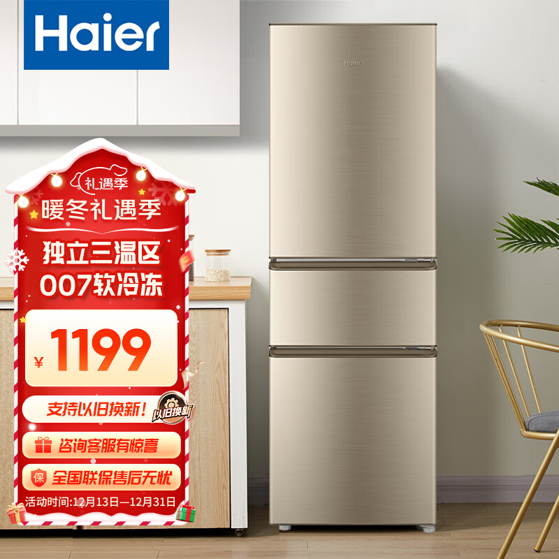 海尔(Haier)冰箱218升三门家用中超薄小型宿舍租房节能省电中门软冷冻电冰箱BCD-218STPS价格:1199.00元!