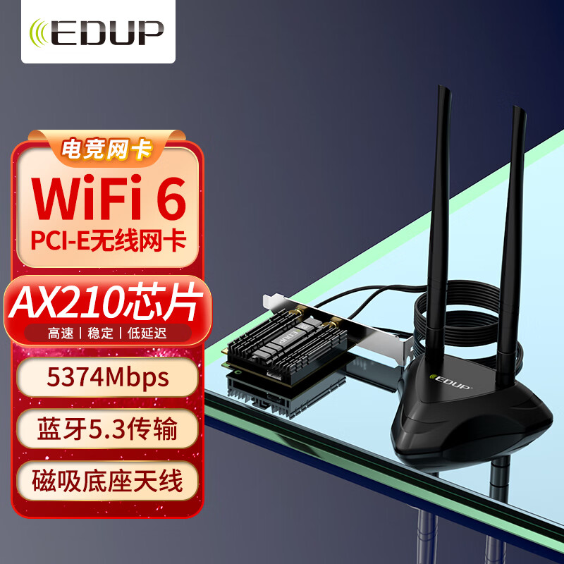 翼联(EDUP)WiFi6无线网卡英特尔AX210 PCI-E台式机网卡电竞千兆网卡5G双频5374M蓝牙5.3延长底座AX210GS Pro价格:219.00元!