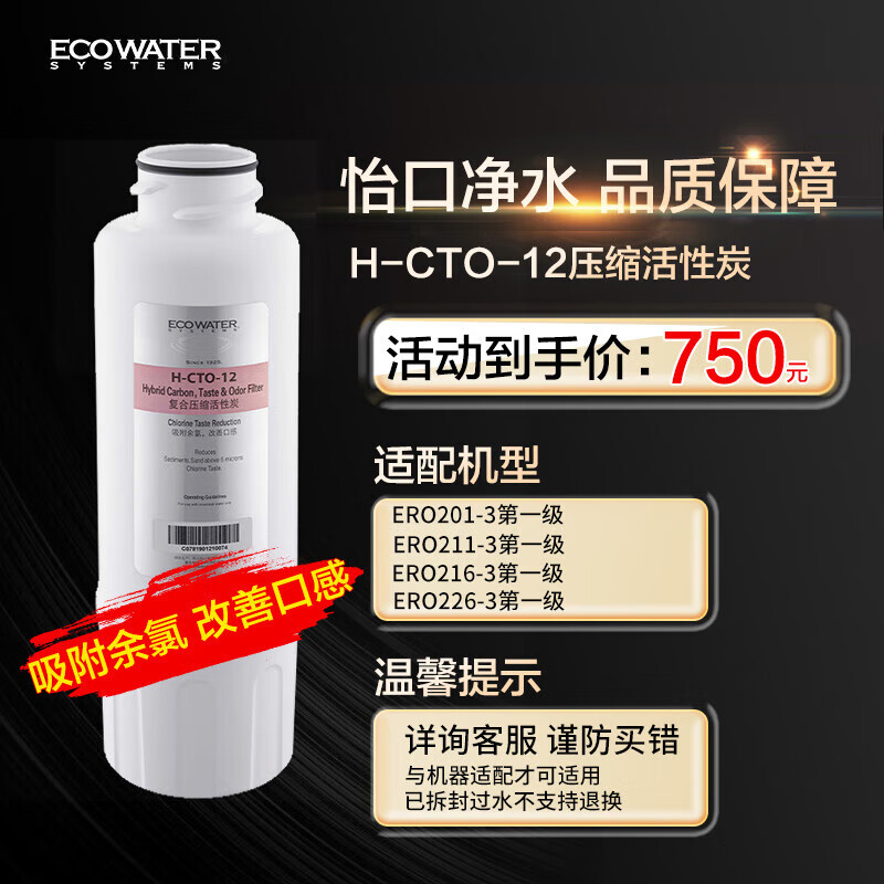 怡口净水(ECOWATER)净水器家用原装耗材 H-CTO-12滤芯 压缩活性炭滤芯 除异色异味改善口感 适配机型详询客服价格:750.00元!