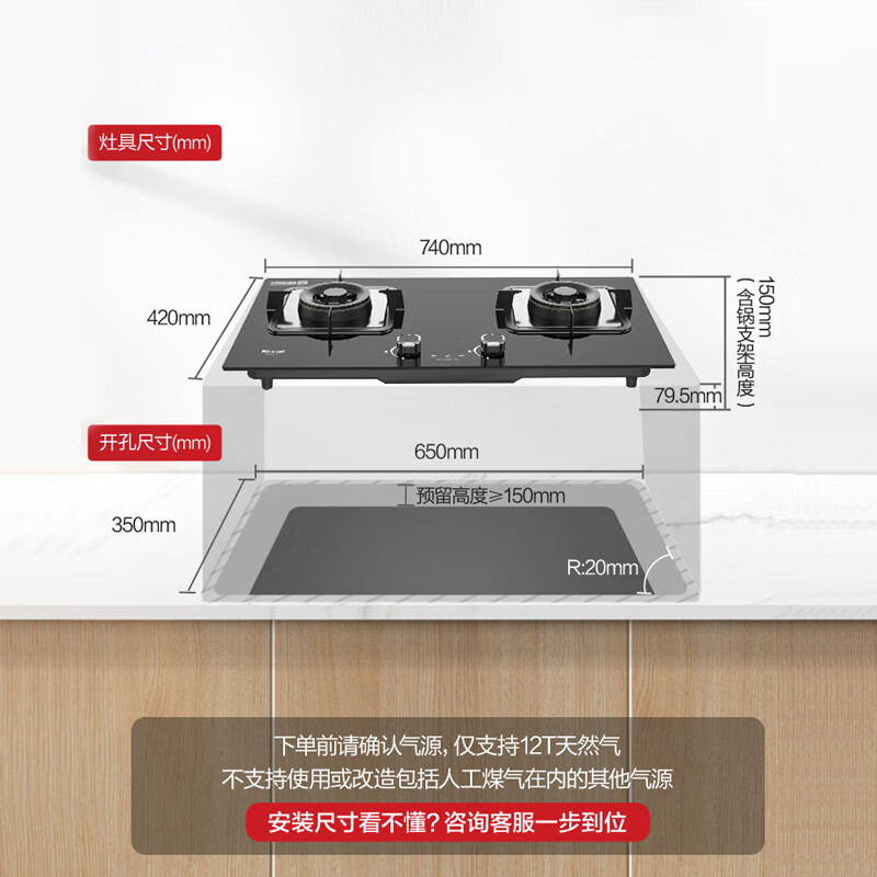 灶具开孔尺寸:640±20mm(灶台挖孔长度)