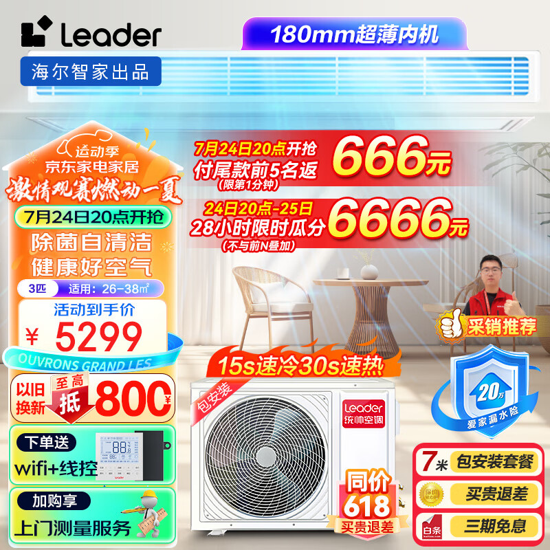 Leader海尔智家出品3匹风管机一拖一中央空调3p嵌入式客厅空调直流变频除菌自清洁KFRd-72NW/72DDB82ST价格:5299.00元!