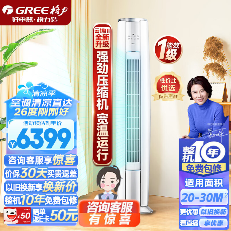 格力(GREE)空调立式 2匹 云锦三代新一级能效变频自清洁智能客厅圆柱空调立式柜机KFR-50LW/NhBa1BAj价格:6399.00元!