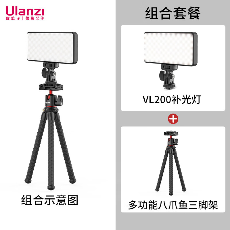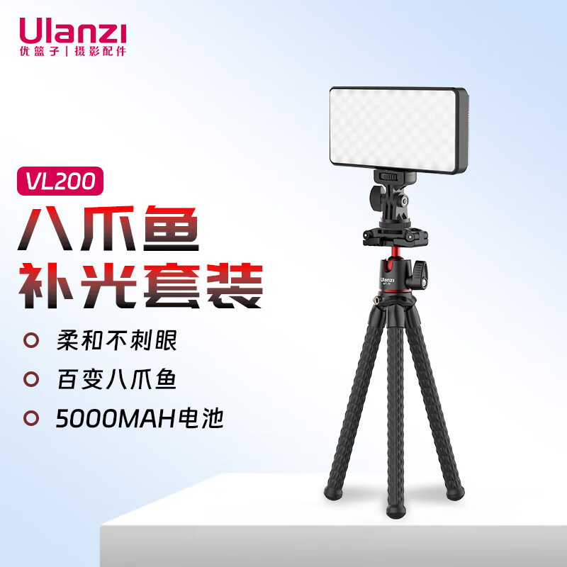 ulanzi 优篮子 VL200双色温补光灯八爪鱼补光套装单反相机口袋便携直播美颜柔光灯人像摄影拍照打光灯价格:239.00元!