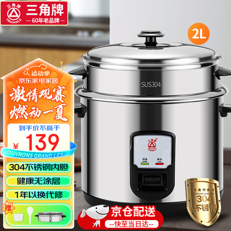 三角牌(Triangle)电饭煲老式电饭锅不锈钢家用煮饭锅米饭锅带蒸笼家庭用 2升304不锈钢价格:139.00元!