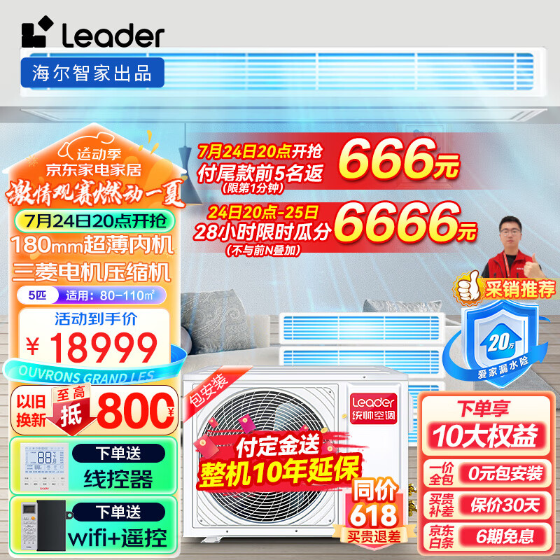 Leader海尔智家出品中央空调一拖四 风管机嵌入式全屋空调智能5匹多联机全直流变频一级能效RFC125STSJVA价格:18999.00元!