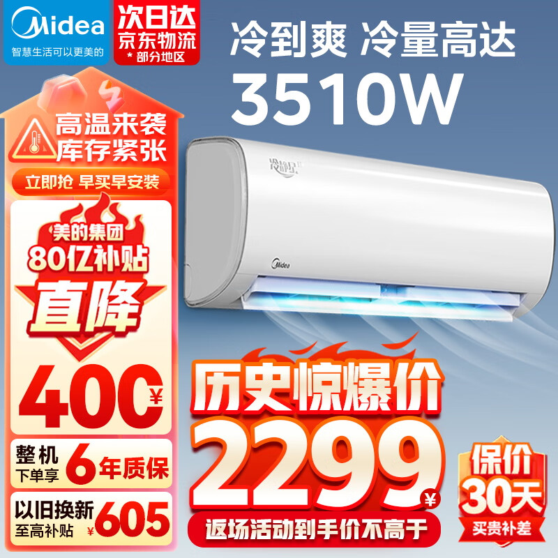 美的(Midea)空调 1.5匹 冷静星 新一级能效变频冷暖 智能家电 家用壁挂式空调挂机 KFR-35GW/BDN8Y-PH200(1)A价格:2299.00元!