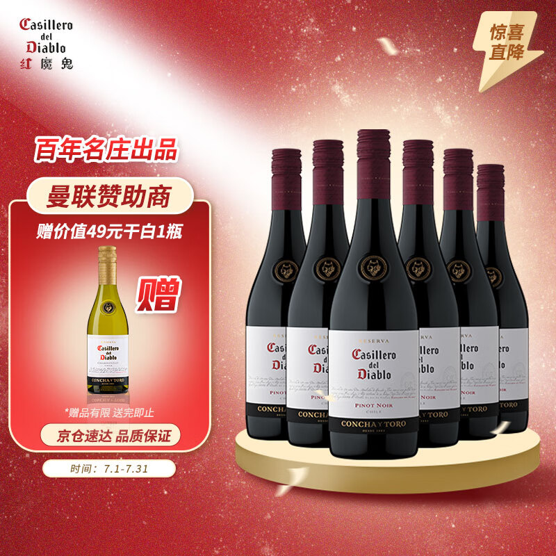 红魔鬼(Casillero del Diablo)珍藏级黑皮诺干红葡萄酒750ml*6瓶整箱 智利进口聚餐红酒价格:359.00元!