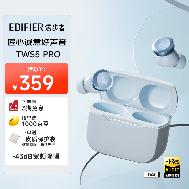 漫步者(EDIFIER)TWS5 PRO真无线主动降噪耳机 蓝牙耳机 运动耳机 适用苹果华为小米 薄雾蓝价格:359.00元!