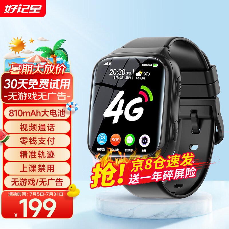 好记星【八仓速发】智能儿童电话手表插卡4G卡通用学生移动电信版防摔游泳级防水wifi精准节日礼物 升级版黑色【加大电池+精准定位+零钱支付+无游戏】价格:229.00元!
