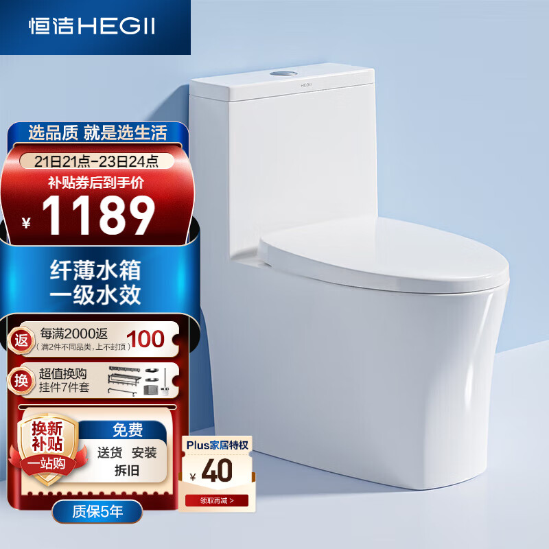 恒洁(HEGII)马桶507 三重瞬冲全包设计 轻薄节水坐便器HC0507PT-400价格:1449.00元!