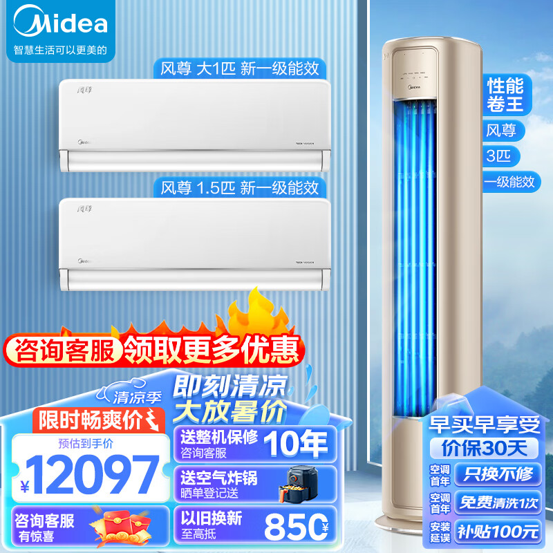 美的(Midea)新一级能效 风尊系列 空调套装 二室一厅套餐 变频冷暖空调 3匹风尊+1.5匹时尚版+大1匹时尚版价格:12097.00元!