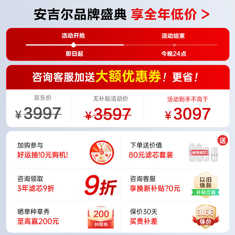 安吉尔净水器家用直饮 哪吒Pro2000 800G净水体验2.07L/min RO膜直饮水机双出水智能联网IOT净水机纯水机 【800G流速净水器+3秒速热管线机】2件套装价格:3097.00元!