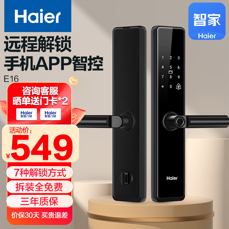 海尔(Haier)智能锁指纹锁智能门锁手机远程解锁入户门木门密码锁防盗门电子门锁HFH-16E-U1 【免费拆旧安装】价格:649.00元!