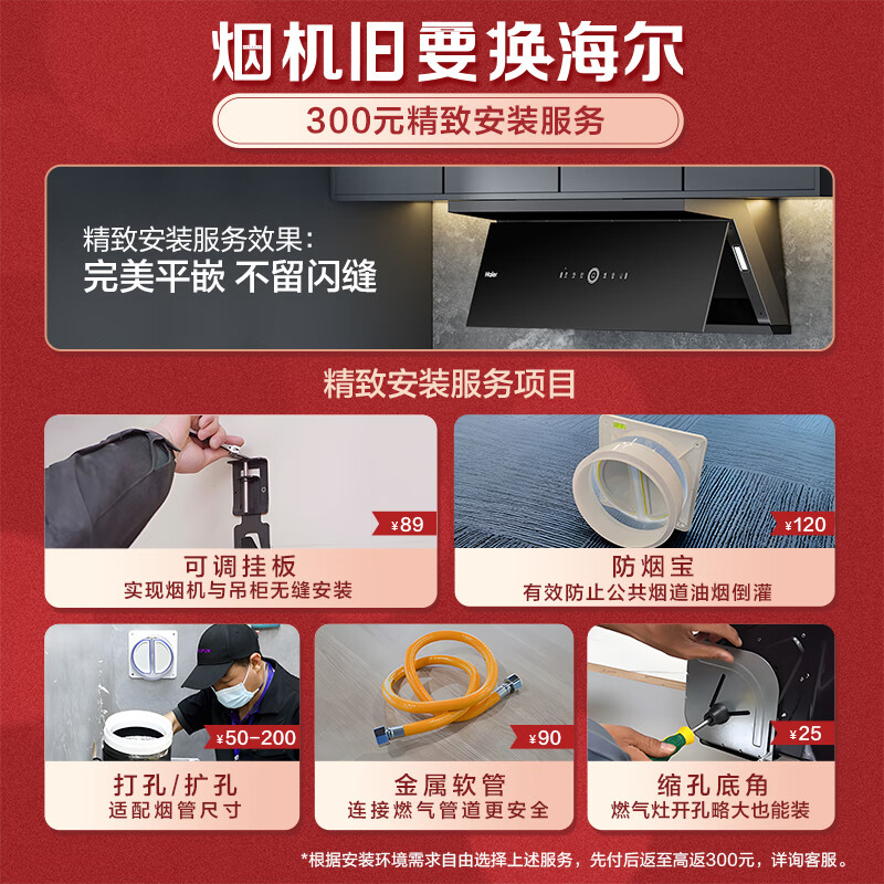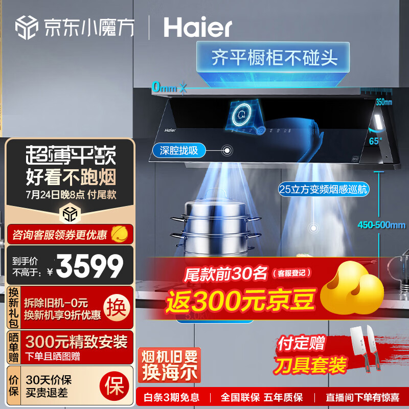 海尔(Haier)抽油烟机 超薄近吸烟灶套装 25m3/min变频有效风顶侧双吸外观 家用吸油烟机燃气灶具C21U1+QE9B1天价格:3599.00元!